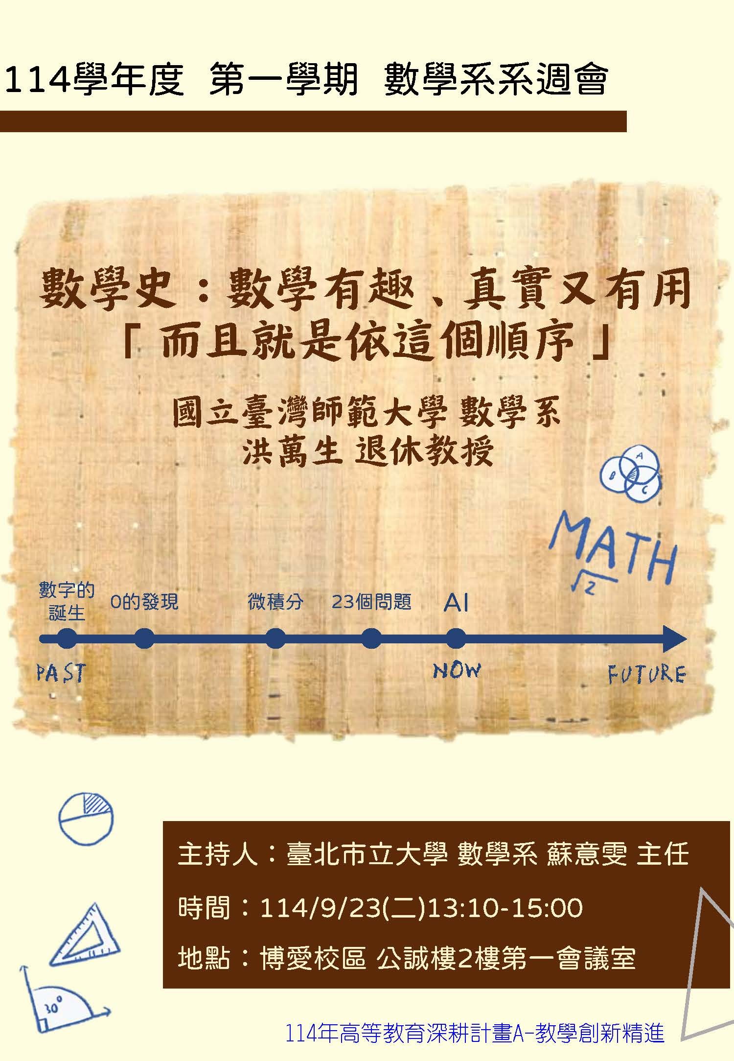 系週會專題演講:114年9月23日(二)數學史:數學有趣、真實又有用「而且就是依這個順序」